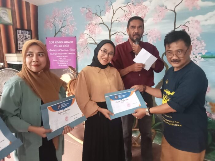Lembaga Budaya Komunitas Batanghari Sembilan (Kobar 9) mengumumkan dan membagikan hadiah berupa uang pembinaan dan sertifikat bagi pemenang Lomba Pantun Kobar 9 Dalam Rangka HUT Palembang ke 1342 Tahun 2024 dari tanggal 15 Mei sampai 28 Juni 2024 , Selasa (2/7) di Sekretariat Kobar 9, di Jalan Monginsidi No 99 Rt 09 Rw 07, Kelurahan Kalidoni, Kecamatan Kalidoni, Palembang.