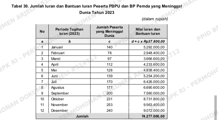 Tabel 30. Jumlah Iuran dan Bantuan Iuran Peserta PBPU dan BP Pemda yang Meninggal Dunia Tahun 2023