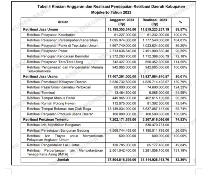 GESAHKITA.COM, MOJOKERTO—-Laporan Keuangan Pemerintah Kabupaten Mojokerto Tahun 2023 menyajikan realisasi Pendapatan Retribusi Daerah sebesar Rp 31.114.926.163,76 atau sebesar 82,30% dari anggaran sebesar Rp 37.804.816.399,00.