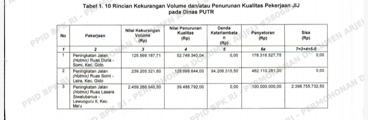 Menurut BPK, Hasil pemeriksaan secara uji petik atas dokumen kontrak, pertanggungjawaban, pemeriksaan fisik di lapangan, dan pengujian kualitas pekerjaan di Laboratorium Balai Besar Pelaksanaan Jalan Nasional Sumatera Utara (LBBPJNSU) dan Laboratorium Teknik Sipil Politeknik Negeri Medan (Palmed), diketahui terdapat kekurangan volume dan penurunan kualitas atas delapan paket pekerjaan pada Dinas PUTR sebesar Rp.578.807.596,30 (Rp3.118.035.017,S 1 + Rp460.772.578,79), serta terdapat denda keterlambatan kurang dikenakan sebesar Rp94.206.3 I 5,50.