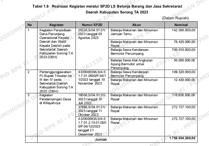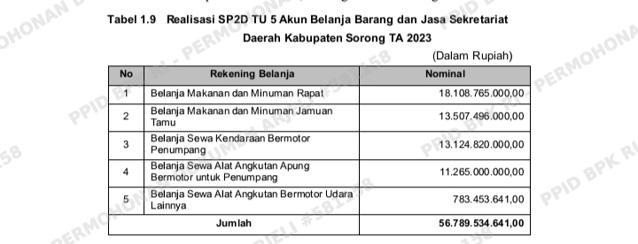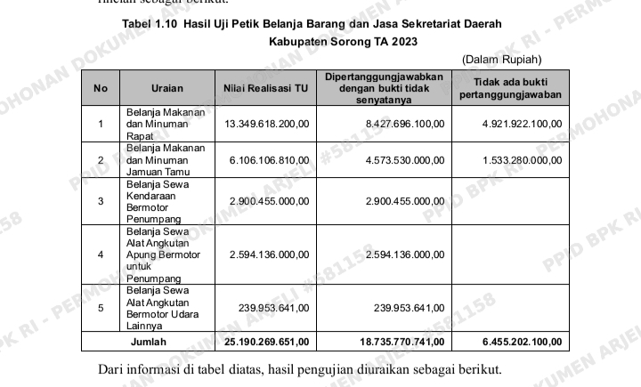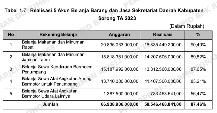 BPK menjelaskan, Pemerintah Kabupaten Sorong TA 2023 (Audited) menganggarkan Belanja Barang dan Jasa senilai Rp659.559.016.900,00 dengan realisasi senilai Rp572.846.128.679,00 atau sebesar 86,85% anggaran. Diantara realisasi tersebut, terdapat realisasi Belanja Barang dan Jasa pada Sekretariat Daerah TA 2023