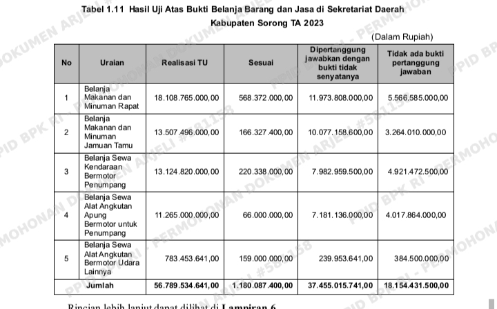 GESAHKITA.COM, SORONG—BPK Perwakilan Papua Barat Daya Temukan Realisasi Belanja Barang dan Jasa pada Sekretariat Daerah Dipertanggungjawabkan Dengan Bukti Yang Tidak Senyatanya Senilai Rp37.455.015.741,00 dan Tidak Didukung Bukti Senilai Rp19.911.365.700,00