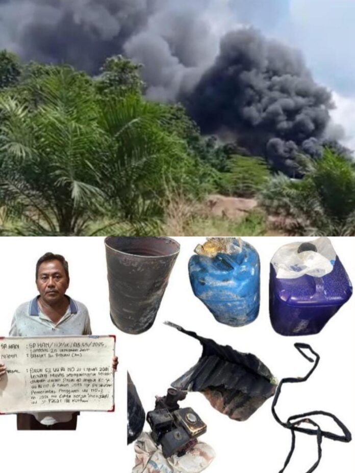 Barang bukti.1 unit mesin sedot,1 selang panjang ±5 meter bekas terbakar, 1 drum besi bekas terbakar, 1 tangki/tungku besi berkapasitas ±6.000 liter, 1 jerigen 35 liter berisi cairan hitam diduga minyak mentah, 1 jerigen 25 liter berisi cairan diduga hasil olahan jenis solar berhasil disita.