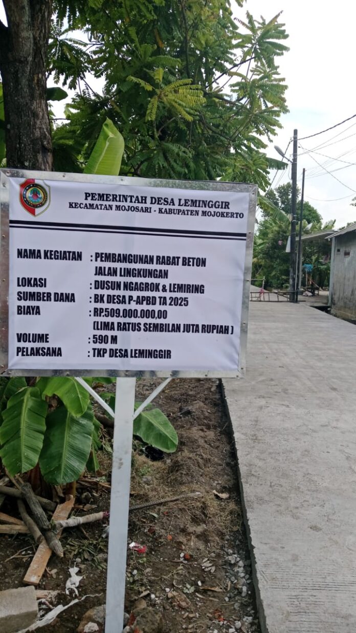 GESAHKITA.COM, MOJOKERTO—Desa Leminggir Kecamatan Mojosari Kabupaten Mojokerto baru saja menyelesaikan pembangunan jalan Rabat Beton Bersumber dari Sumber dana dari bk desa P APBD kab Mojokerto 2025.
