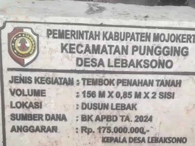 Mojokerto, GESAHKITA – Realisasi Dana Desa (DD) Tahun Anggaran 2024 di Desa Lebaksono, Kecamatan Pungging, Kabupaten Mojokerto, menarik perhatian seiring munculnya dugaan kuat penyimpangan dalam pelaksanaan program sosial, pembangunan, serta proyek infrastruktur. Meskipun dana telah tersalurkan 100%, terdapat indikasi ketidaksesuaian volume pekerjaan dengan spesifikasi yang telah ditetapkan.