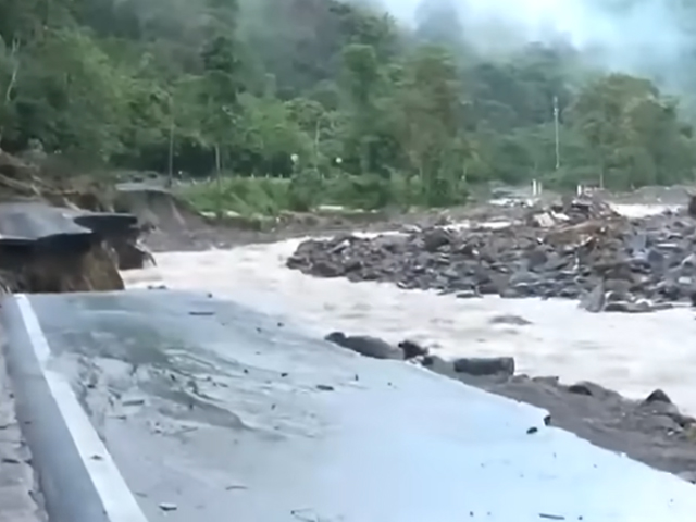 Kondisi terkini di lokasi menunjukkan kerusakan infrastruktur yang sangat parah, dengan badan jalan terputus sepenuhnya akibat terjangan arus deras.