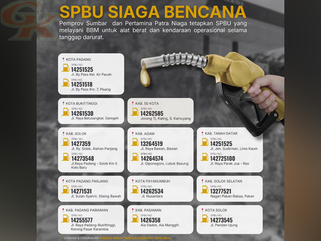 GESAHKITA – Dalam rangka memastikan kelancaran operasional penanganan bencana hidrometeorologi, Pemerintah Provinsi Sumatera Barat (Sumbar) bersama BPH Migas dan Dinas ESDM telah menetapkan 16 Stasiun Pengisian Bahan Bakar Umum (SPBU) sebagai titik penyaluran BBM solar alokasi khusus. SPBU ini beroperasi sebagai SPBU Siaga Bencana dan tersebar di sejumlah kabupaten dan kota terdampak.
