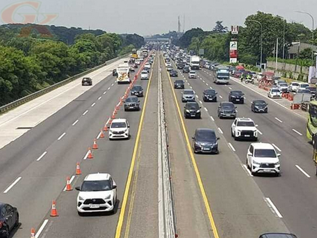 GESAHKITA – Petugas kepolisian menerapkan rekayasa lalu lintas contraflow di jalan Tol Jakarta-Cikampek arah Jakarta pada Minggu sore.