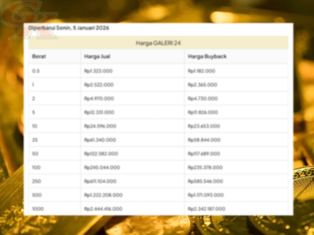 GESAHKITA – Berdasarkan data terbaru dari laman resmi Sahabat Pegadaian per Senin, 5 Januari 2026, produk emas Galeri24 dan UBS kompak tidak mengalami perubahan harga dibandingkan hari sebelumnya.