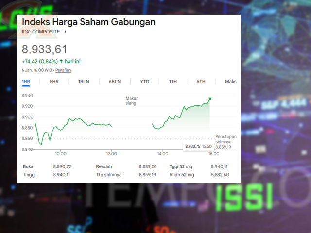 GESAHKITA – Indeks Harga Saham Gabungan (IHSG) kembali menunjukkan taji pada penutupan perdagangan Selasa (6/1/2026). Indeks melonjak 74,42 poin atau 0,84% ke level 8.933,61, yang menjadi rekor penutupan tertinggi sepanjang masa (all time high) baru.