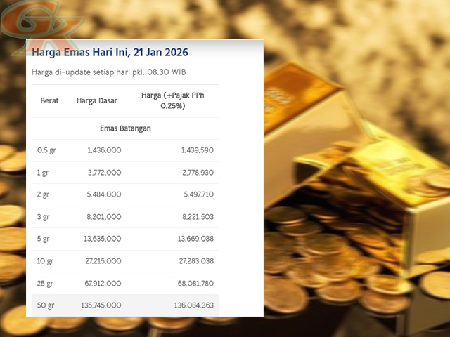 GESAHKITA – Harga emas batangan PT Aneka Tambang Tbk (Antam) mencatatkan kenaikan signifikan pada perdagangan Rabu (21/1/2026). Melansir laman Logam Mulia, harga emas melonjak Rp35.000 per gram, membawa komoditas aman (safe haven) ini ke level tertinggi baru.